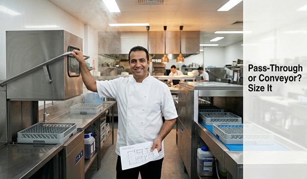 Pass-through and conveyor dishwashers serve different volume thresholds, but the wrong choice shows up in two ways: a pass-through that cannot keep up during peak service, or a conveyor that runs at 30% capacity for 80% of the day. Both are expensive mistakes. The decision should be made on average daily rack count and available floor space, not peak-hour panic.